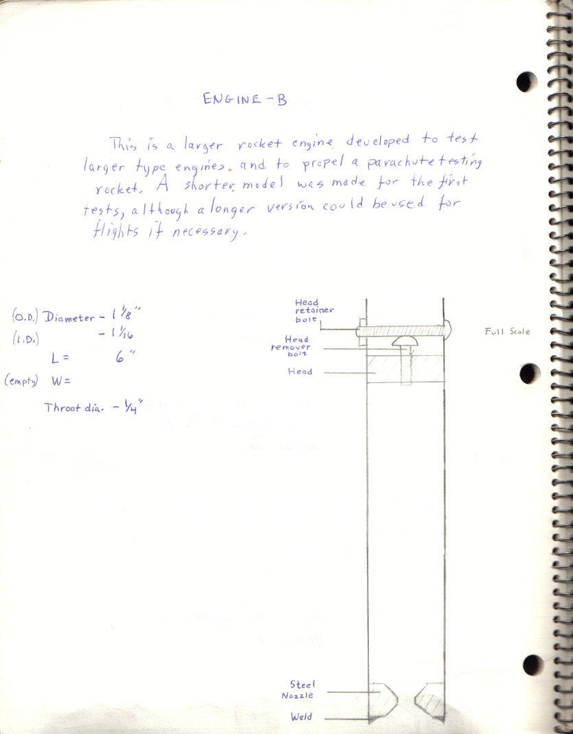It was Saturday, April 16, 1972, when we headed out to the floodway for the first "B Series" rocket launch. Despite the wind blowing out of the north at 10 mph, it was a fine day for a hopefully momentous flight. The "B-1" rocket was loaded onto the new launch pad, comprised of a welded-steel base with a 10-foot tall launch rod of ½ inch steel. Basically, it was a scaled up, heavy-duty version of my model rocket launch pad. Ray and his Dad headed out to a viewing area some 500 feet away from the pad, while my brother and I made the electrical connections to the rocket motor, armed the parachute system, and lastly, filled the tin can of our "hydraulic timer" with water. After confirming that the water was draining as planned, we scurried off to where our launch guests were positioned. By now, a good portion of the two minute delay period had elapsed, so I promptly got my camera trained on the rocket, and I waited breathlessly, literally. What happened next seemed nearly surreal, as suddenly a large cloud of white smoke silently materialized around the base of the launch pad. Then with "tremendous speed", as I later wrote in my logbook, the rocket accelerated skyward, in complete apparent silence, gaining altitude even more rapidly than I had optimistically expected. A moment later the loud shriek sound, delayed by the distance, of the powerful motor reached us, catching me a tad off guard. I suspect it was this sudden loud shrill that triggered me to snap the camera shutter and take my first really good photo of a rocket in flight. It wasn't long before the rocket disappeared from sight due to the high altitude it had attained. It was then that I spotted the parachute, fully inflated, drifting earthward. The parachute was only a few hundred feet above the ground, so it was obvious that it had deployed way too early and had separated from the rest of the rocket. We soon heard the whining sound of the rocket as it began to pick up speed on its ballistic descent. A sound quite similar to that of ascent (and one that I would hear all too often again in the future!), described in my log book as best I could, simply as a "rushing air" sound increasing in intensity until a final dull thud was heard. We had spotted the rocket coming down, quite distant and upwind of the launch site. Despite the ballistic return phase, the flight was simply incredible in my mind. We soon found the rocket, burrowed up to its fins in soft, wet bog. This turned out to be of good fortune, as it missed the hard packed gravel that comprised most of the launch zone. The rocket received very little damage, but surely needed a very good scrubbing to clean out the jam-packed mud. There was one surprise in store for me when I conducted the post-flight inspection of the rocket. Curiously, the ejection charge had not fired! Just exactly how the parachute deployed is a mystery that remains to this day.