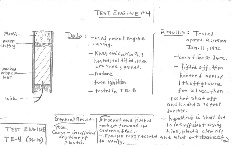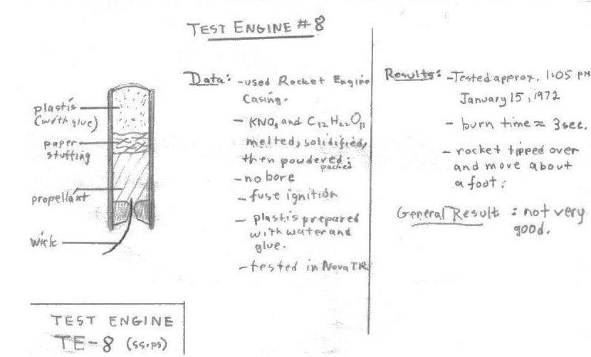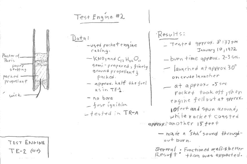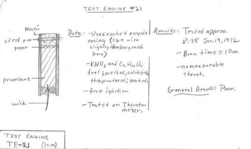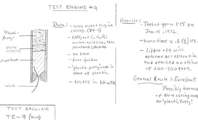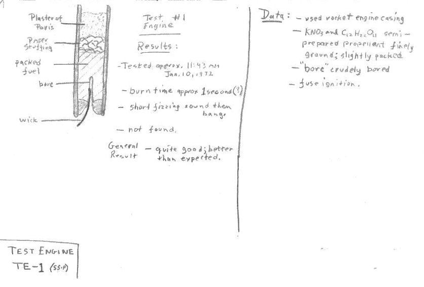 I spent an enjoyable summer and fall of 1971 building and flying model "kit" rockets powered by commercial model rocket motors. This was my first foray into rocketry and I soon found that this hobby was an exciting and challenging one. I learned the basics of aerodynamics, stability, motor ignition, safe recovery, tracking and organizing. There was, however, one facet of rocketry which eluded me. I was fascinated by the rocket motor, and although the Estes and Centuri catalogues showed neat cutaway views and thrust curves, these were not enough to satisfy my curiosity and desire to know more about the workings of this technological marvel.At the end of flying season, when the weather got too cold and winter was settling in, I turned my attention to this particular attraction. I had dozens of spent motor casings. Being somewhat of a pack rat and perhaps possessing more than a bit of insight, I kept most of the used motors. It was around this time that I had come into possession of a copy of Brinley's book on Amateur Rocketry. I began doing ad hoc experiments with the intriguing sugar-based propellant that was briefly mentioned. Needless to say, it didn't take long for me to come to the realization that these spent model rocket motors were begging to be reloaded with this curiously energetic concoction. Knowing that I was unlikely to meet with immediate success, I kept a record of all the attempts in order to tackle this challenge in a more systematic manner. The TE series of static and flight tests were the outcome of my particular melding of amateur and model rocketry. As expected, this undertaking proved to be challenging and eventually I realized that a better approach to achieving eventual success was with the creation my own rocket motors built from scratch. This endeavour culminated in the creation of my first entirely scratch-built rocket motors, which led to the breakthrough in rocket performance and reliability that I'd been seeking. |
