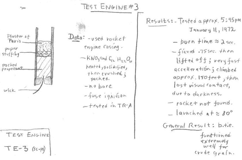 TEC-1 was the "breakthrough" I was seeking. Not only did the motor perform very well, producing a thrust level far beyond any of the model rocket motors that I had used (or was available at that time, in fact), but it perfomed consistently and reliably over three firings. A stretched version of TEC-1 was subsequently made and went on to power my first amateur rocket flight on February 26th, 1972.