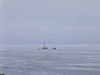 Launch ReportSunday, March 23, 2003The plan called for two rockets to be launched on this day, Frostfire One, and Rob's Smokin' Joe hybrid rocket, which has a similar altitude goal, and was the first test of his rocket with a thermally-stabilized NOX tank. We wanted to fly both rockets right after sunrise, when winds are calmest. As such, I arose that morning at the ungodly hour of 4 AM, and proceeded to pack up the rocket and other needed supplies for the long journey to the Ice Station Zebra launch site. At this time, I also activated and installed the hand-warmer packet into the RDAS canister. The weather at this time seemed quite suitable, as there was no wind, and the temperature was a few degrees above the freezing mark. When we arrived at the test site, a vast frozen lake, the sun was just rising, and a bit of a wind had picked up. This was a good thing, however, as a thin fog had blanketed the area, which then began to disperse. We proceeded to unload the rockets, launch support & video equipment, and load up the two sledges for the 3 kilometre walk out toward the central area of the lake. The partly-assembled Frostfire One rocket was carefully placed inside a ski bag, and slung over my shoulder for the journey. We soon discovered, as we began our trek, that areas of the ice were pocketed with slush a few inches deep. This was not a particular concern, as we'd been prepared for this possibility, and had made sure our equipment was suitably protected and that our boots were waterproof. The ice base was very firm, however, being nearly a metre thick.