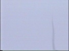 ![]() Moment of liftoff as seen from camera fixed on tripod near launchpad After approximately two seconds of flight, the rocket disappeared into a patch of cloud, and visual contact was lost by me (operating the videocamera) and by Rob. The sound of the motor could be heard for an additional two seconds, at which point we simply waited and gazed upward for any trace of the rocket. We were so transfixed on making visual contact that it didn't occur to either of us to listen over the radio receiver for signs of "life" ! However, after about 10 seconds, the deployed drogue chute was spotted. It was clear to us that this was too early for normal drogue deployment, so it was clear that something had gone wrong. Rob then noticed that the rocket was descending as separated entities. Just then, we heard, then saw, some fragments of PVC fuselage fluttering down. One fragment, to our surprise, landed no more than 15 feet (3 metres) from where we were standing...! It was apparent to us that one section of the fuselage was attached to the fully inflated drogue chute. Another section was spotted descending free-fall, in a horizontal attitude. After an additional 10 seconds, a loud "rushing air" sound was heard, characteristic of high speed ballistic descent, followed by a thud of impact. This occurred nearly simultaneously with the touchdown of the section that had been falling sideways. After an additional 15 seconds, the third section of the rocket that was tethered to the drogue chute landed gently. All three sections of the rocket came down within about 100 feet (30 metres) of the launcher.