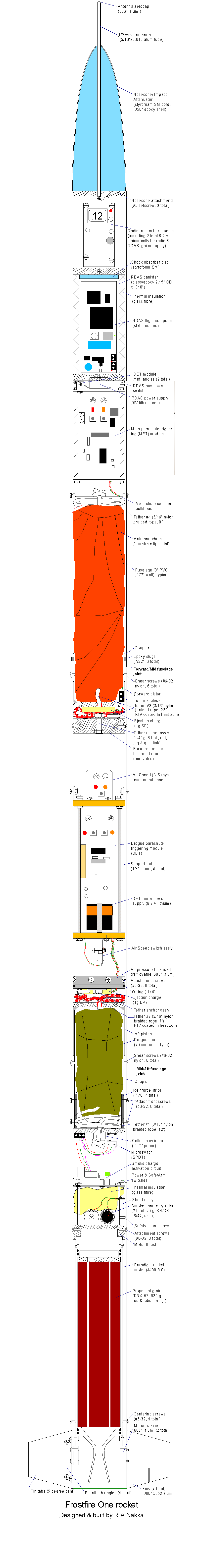 IntroductionThis web page presents details of PRMS-2, the official designation of the test flight of the Frostfire One rocket. The Frostfire One rocket is, in essence, the Boreas 1 rocket that was utilized for Flight #5, with certain modifications and enhancements. The motor used for this flight was the recently developed Paradigm solid rocket motor, which was successfully static tested (PRMS-1) on January 12, 2003. As with the Epoch motor used for the Boreas series of flight tests, the Paradigm is powered by the new RNX epoxy-based composite propellant.
