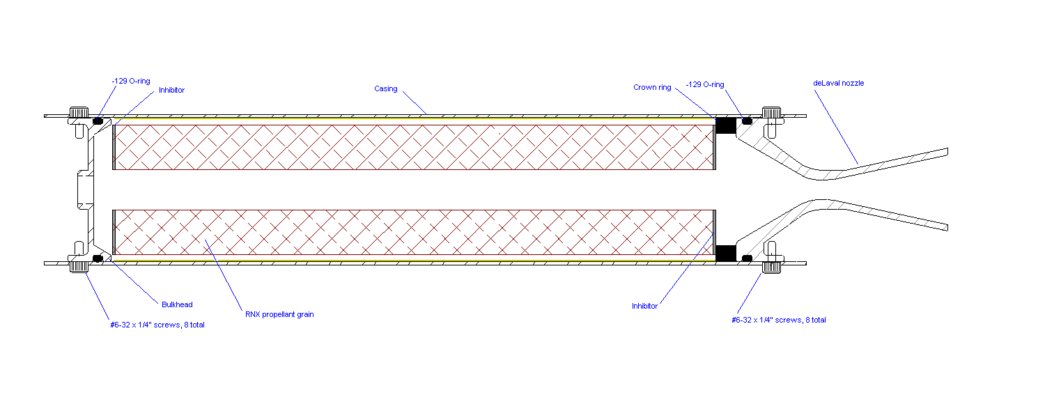 IntroductionWork on designing the "I-class" Epoch solid rocket motor began in August 2002 after a series of developmental static tests with its precursor, the RNXS motor, had concluded. This marked the successful development of the RNX epoxy-based composite propellant. The Epoch represents the first motor designed specifically for use with the RNX propellant. Two prototype motors were fabricated, one being essentially the same as the motor described here, fitted with a supersonic deLaval nozzle. The second had a truncated nozzle that lacked a divergent portion. The motor with this truncated "sonic" nozzle was used for early static testing involving fine-tuning of the RNX formulations. Since only chamber pressure was being measured in these tests, it was felt that there was no need for a supersonic nozzle. The motor with the supersonic nozzle was intended for propellant characterization and for motor performance measurements, and later, for rocket flights.To date, a total of 28 Epoch motor firings have occurred, consisting of 19 static firings and 9 flight tests (Boreas and Zephyr rockets). Included in those static tests were firings of new experimental variations of the RNX propellant, leading to the eventual development of the three "standard" RNX formulations: RNX-57, RNX-71V and RNX-73. The main difference between these three versions is the brand of epoxy used. Thanks to the relatively low combustion temperature of the RNX propellant, the Epoch motor is fully reusable, needing only to be cleaned between firings, and having the O-rings, crown ring and thermal liner replaced. Cleaning is done with detergent and hot water. A crusty iron oxide residue that typically forms on the nozzle flow surfaces is removed using a scraping tool and diluted muriatic acid. The name "Epoch" was chosen to symbolize the advent of a new-millenium motor featuring the first usage of a promising new AER solid propellant.