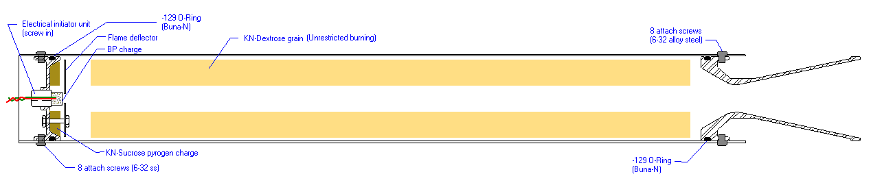 As a booster, the Juno rocket motor is designed to have a short burn, high thrust operation, which will provide the rocket vehicle with a rapid climb off the launch pad, and achieve ample velocity to ensure a stable vertical attitude for second stage firing. To deliver the desired thrust profile, the motor utilizes a single hollow cylindrical grain of approximately 650 grams (1.4 lbs) mass, with unrestricted burning. As such, the burning surfaces consist of the core, outer grain surface, and both ends, resulting in a slightly regressive theoretical thrust profile. |