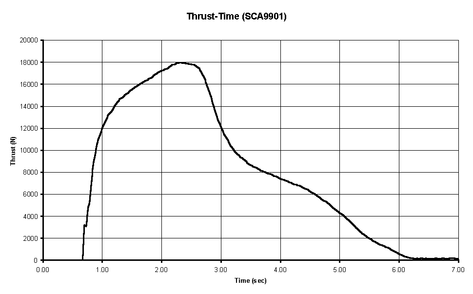 ![]() Figure 10 --Thrust curve for NEAR's SCA9901 "Phenix" motor It would appear that KN-Sorbitol has an odd burn rate v.s. pressure behaviour, when burned in a motor, which did not show up in the Strand Burner tests that were done to characterize the burn rate for this propellant. One is tempted to put the blame on erosive burning. However, the observed effect is more the opposite. Erosive burning would produce an enhanced burning rate initially, when the chamber duct area is minimum. The effect would then drop off as the grain web recedes and the duct area increases. The observed phenomenon is such that burnrate is initially much lower than expected. More research, including dedicated motor testing, as well as a closer examination of existing data, needs to be conducted to try to explain (and hopefully characterize) this unusual and puzzling phenomenon. |