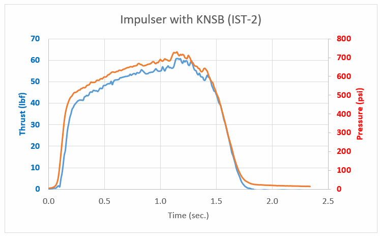 The last motor tested had a KNSB grain with a pseudo-finocyl configuration. The primary goal of the test was to see if the pressure curve matched the theoretical Kn curve. It was found to match quite well. In the near future, I plan to test fire a grain with a 7-pointed star configuration, which theoretically produces a much more neutral burn.