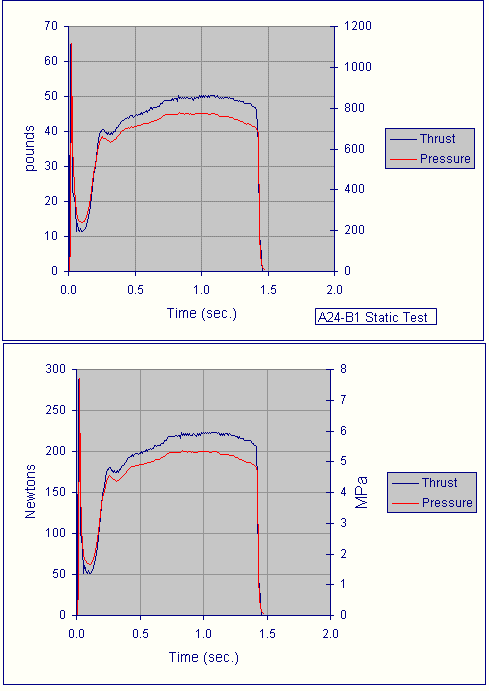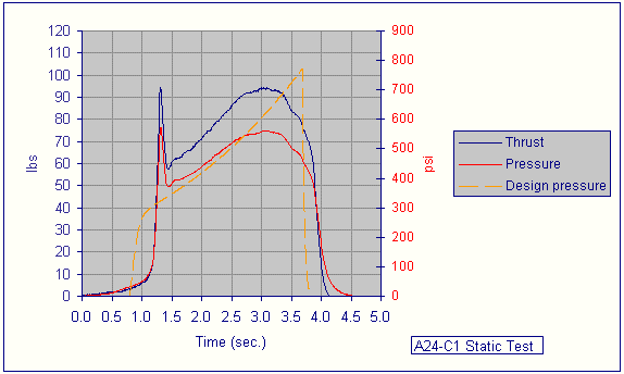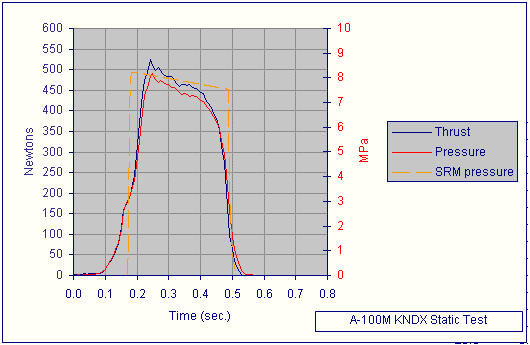 Two other motors were static tested. One was the new J-class motor powered by a half-kilogram of A24 composite propellant based on ammonium nitrate, aluminum and neoprene. This motor, deemed A24-C1, is a scaled-up version of the A24-B motor successfully developed earlier. This motor proved difficult to ignite, mainly due (in hindsight) to undersized igniters. After a number of attempts, the motor did successfully fire after a delayed start-up, and performed in a most impressive manner. The total delivered impulse was indeed mid J-class (977 N-sec) and would have been even higher if the start-up was cleaner. The characteristic velocity (c-star), which is a key measure of propellant merit, was a satisfying 1350 metres/sec. This compares to about 850 metres/sec typically obtained for sugar propellant.