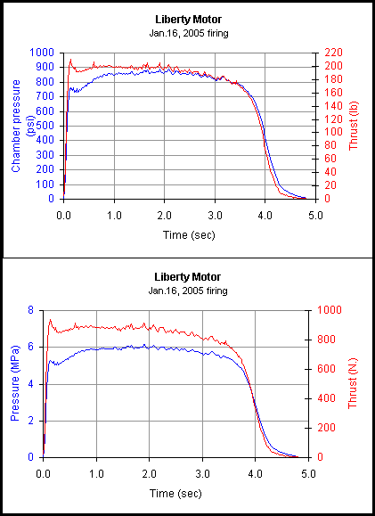 | January 18, 2005 The new Liberty "L-class" solid rocket motor was successfully static tested on January 16, and performed flawlessly on its maiden firing! This is the largest motor that I have successfully tested, to date. The Liberty motor met its design goal, delivering 3337 Newton-seconds of impulse ( click for performance curve). The motor is powered by RNX-71V potassium nitrate/epoxy composite propellant in a "rod & tube" grain configuration.