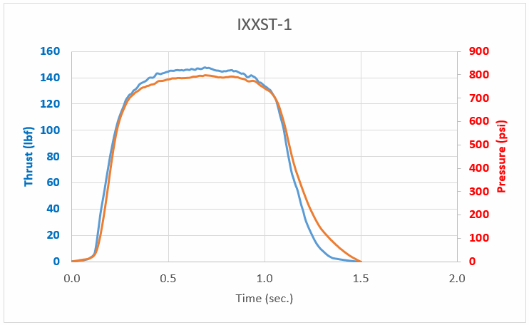For this example, the thrust and pressure data from static test IXXST-1 will be used. This was the first test firing of the KNDX powered Impulser-XX "I-class" rocket motor that occurred on June 3rd, 2018. The thrust and chamber pressure curves are shown below.