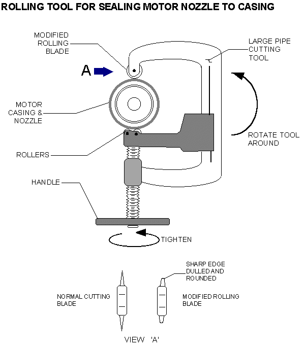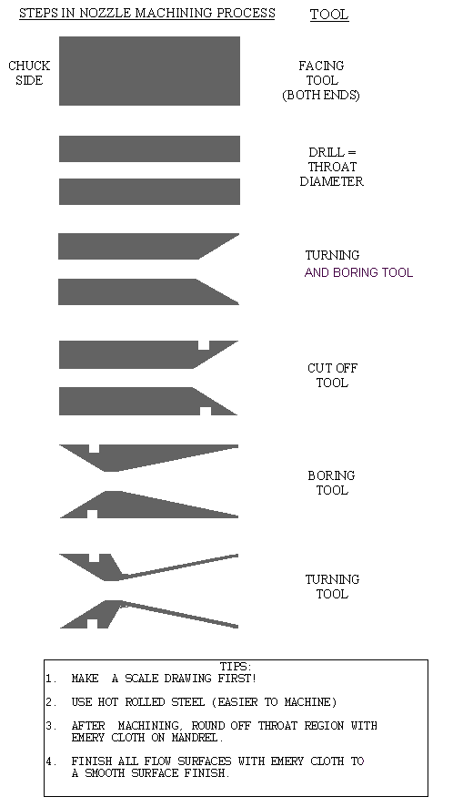 ![]() Figure 1 -- B-200 Rocket motor componentsPerformanceThe thrust function for this motor powered by KN-Sucrose is shown in Figure 2a below, achieving a maximum thrust of 260 pounds (1157 Newtons), and a total thrust time of 0.38 seconds. This performance graph was based on results from a static test of the motor (AST-17). The total impulse is 65 lb-sec (288 N-s), which fits it into an "H" class designation. The high thrust combined with a short burn time provides for very quick acceleration of the rocket, which is beneficial for providing rapid aerodynamic stability of the rocket vehicle after departing the launch guide-rod. The propellant grain is "free-standing", which means that it fits loosely within the casing (not case-bonded). Burning is completely unrestricted, such that the grain burns on both inner and outer diametrical surfaces, as well as both ends. This burning characteristic was chosen to avoid structural loading of the grain, as would be the scenario with a case-bonded grain, a particularly important consideration considering the high modulus (stress / strain), brittle nature of the propellant. This motor is capable of boosting a 3 inch (7.6 cm) diameter rocket, with a mass of 4.5 lbs (2 kg), to an altitude approaching 2000 feet (600 metre) (this was typical of the rockets which I launched). If the rocket diameter is reduced to 2 inch (5 cm), the same rocket powered by the B-200 motor would achieve a peak altitude of close to 1/2 mile (0.8 km). ![]() Figure 2a -- B-200 delivered performance graph![]() Figure 2b -- Graph of Kn and propellant web thickness as a function of web regression![]() Figure 2c -- Comparison of theoretical performance for the Sucrose v.s. Dextrose propellantNozzleThe B-200 nozzle is a conical profile, convergent-divergent, supersonic type. It has a 30 degree convergence half-angle, and a 12 degree divergence half-angle, and has an area expansion ratio of 8.0. It is machined from a single piece of hot-rolled (HR) or cold-rolled (CR) mild steel bar stock (typically C1018), with polished inside flow surfaces. Of particular importance is the throat region, being the most critical with regard to motor performance. The nozzle contour is rounded at the throat to avoid sharp discontinuities * in profile. The nozzle has a groove machined around the outer perimeter of the convergent section, to provide a recess for the nozzle retention screws. Six 1/4 inch hi-strength set screws, which engage into threaded holes in the casing, retain the nozzle. The nozzle is not normally removed once installed (propellant is loaded at the head end). To reduce leakage between the nozzle and casing, the casing is rolled around its circumference (after insertion of the nozzle) utilizing a customized tool which effectively reduces the casing diameter locally, providing a nearly gas-tight seal. This tool is essentially the same as a constictor tool, as used in HVAC applications. More recently, coating the nozzle and filling the groove with silicone RTV has been used to further minimize gas leakage. * to reduce shock losses, as well as to provide a more gradual acceleration of the exhaust gases, important to prevent particle velocity lag associated with two-phase flow. ![]() Figure 3 -- Details of B-200 nozzleCasingThe casing is made from seam welded steel tubing, specifically, 1-1/4" Electrical Metallic Tubing (EMT), also referred to as "thin-walled conduit". This particular tubing has the minor disadvantage of being zinc coated, which would tend to blister when the motor is fired, as the exterior casing surface briefly reaches a temperature of about 800 deg.F. (430 C.) at some locations. I generally would turn down the casing (using a metal lathe) to remove the zinc coating, and to reduce the wall thickness to 0.060 inches. This thickness still provides for a safety factor of 1.5 based on hoop stress at MEOP (Maximum Expected Operating Pressure, 1600 psi) compared with the ultimate strength of the material. This wall thickness also ensures no permanent deformation (yielding) of the casing under operating pressure. ![]() Figure 4 -- B-200 Motor casing dimensionsMotor HeadThe motor head (Fig. 5) is basically a pressure bulkhead which, together with the gaskets, serves as a closure to seal the combustion gases within the motor to generate the pressure required to produce thrust. The head is not directly attached to the casing, rather, it is retained by the safety shear pin assembly. It is subjected to the full force associated with the combustion chamber pressure acting over it’s area., and since the shear pin spans across the middle of the head, the head is subjected to bending stresses. To reduce weight, the head is hollowed out at the centre, yet around the perimeter, it is sufficiently thick to act as a piston, and to provide bending stiffness. The head is machined from a piece of cold-rolled (CR) steel bar. ![]() Figure 5 -- Details of B-200 headGasketsThe gaskets, which are installed directly behind the head, serve the important function of sealing the front of motor to prevent excessive gas seepage. The gaskets, of which there are typically four installed, are discs cut from asbestos laden heat-resistant gasket material, of the type used for sealing high pressure, high temperature water pumps. The gasket material has a thickness of 1/16 inch (1.6 mm). These are cut to size of a diameter slightly greater than the inside diameter of the casing, and are carefully installed after insertion of the grain. The gaskets are installed by “dishing” the middle portion (concave downward) into the casing. The head is then installed, pushing the gaskets down such that they butt against the head in the final installed position. In this manner, when the motor pressurizes upon firing, the pressure forces the gaskets flat against the head, subsequently forcing the perimeter edges of the gasket tightly against the casing wall. More recently, coating the gasket perimeter with silicone R