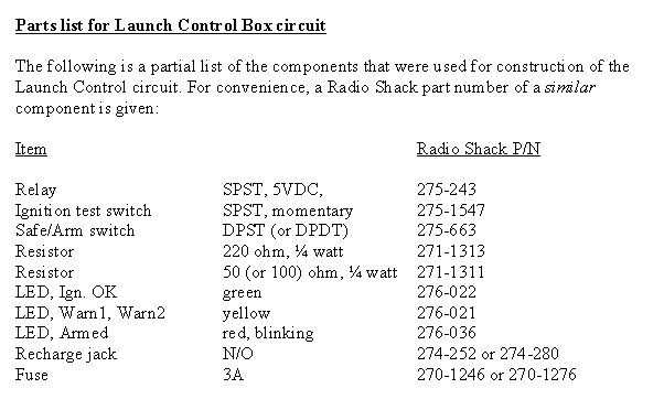 The Launch Control Box is equipped with 4 AA nicad (rechargeable) batteries, providing a 5.2VDC power source. This supplies power for the engine igniter, as well as the control circuitry. The circuit allows for a pre-launch continuity check of the engine igniter by passing a small (25mA) current through, utilizing an LED indicator for confirmation.